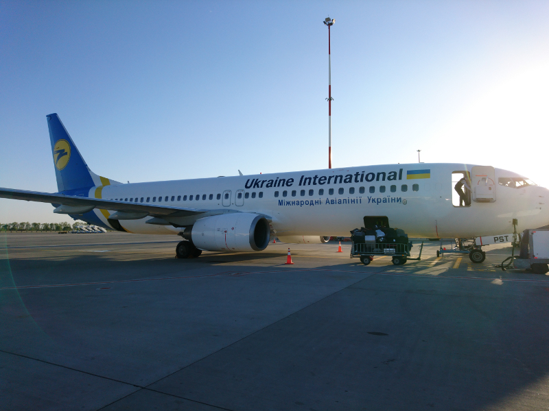 Mit geringfügiger Verspätung hebt der Vogel von Ukrainian Airlines am Airport München ab. Eingepfercht in der Economy Class der Boeing 737-800 reicht die Beinfreiheit gerade so aus, um aufrecht sitzen zu können, ohne sich die Kniescheiben zu brechen. Immerhin habe ich mir in der Dreier-Sitzreihe einen Platz am Fenster gesichert. Die Sardinenbüchse ist gut gefüllt und über den Gang hallen die Gesprächsfetzen eines wirren Gemischs aus verschiedenen Sprachen. Neben mir sitzt mein Begleiter, außen ein schweigsamer Mann, der als Russe durchgehen könnte. So bedanke ich mich freundlich auf Russisch, als er aufsteht, um uns Platz nehmen zu lassen.