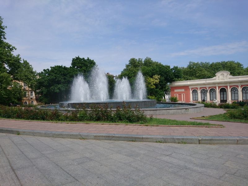 Sie will sich an der Oper treffen, die etwa zehn Minuten zu Fuß von unserem Hotel entfernt liegt. Vor dem prunkvollen Gebäude der Oper von Odessa erstreckt sich ein weitläufiger Platz, dessen Zentrum ein großer Springbrunnen bildet. Wartend sitzen wir auf einer der umherstehenden Bänke; es gibt freies WLAN.