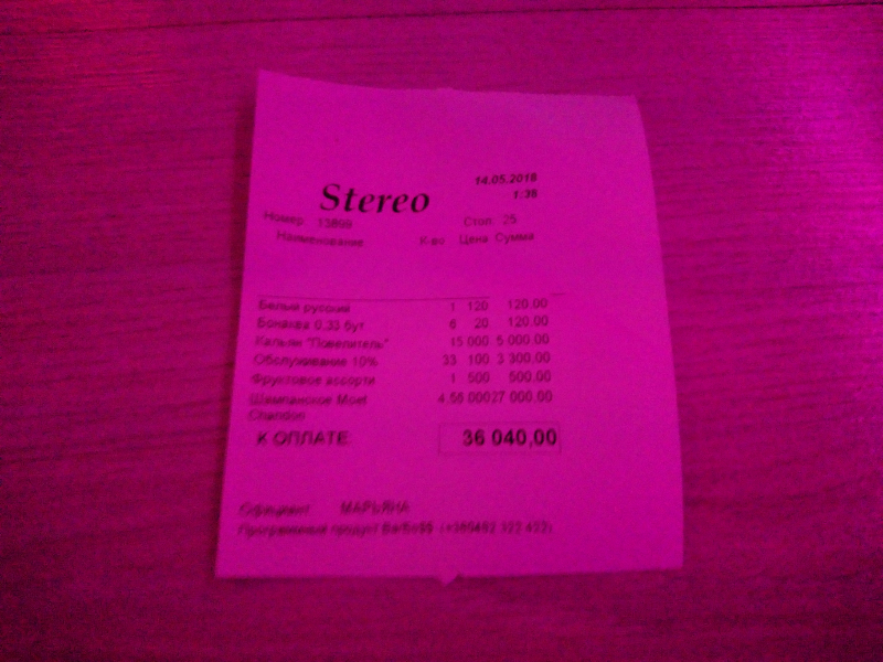 Offensichtlich wurde hier gerade noch eine Runde geordert. Kurz darauf werden noch einmal weitere Gläser des mutmaßlichen Schampus an den Tisch gebracht. Einige Minuten später folgt dann die Rechnung. Ich klappe die Mappe auf und falle vom Glauben ab. Die geforderte Summe beträgt nicht weniger als 36.040 Hrywnja, was etwa 1.200 Euro entspricht. Man will uns betrügen, und zwar richtig. Zur Beweissicherung mache ich ein Foto und informiere Rudi darüber, dass sich meine Bedenken bestätigt haben.