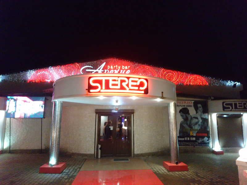 Schließlich hält das Taxi vor einem Club im Nirgendwo, rundherum ragen finstere Plattenbauten in den Himmel, die Fassaden wirken fast schwarz. Ein ukrainisches Ghetto und definitiv kein feines Ausgehviertel; Menschen sieht man keine. Es folgt eine kurze Auseinandersetzung zwischen Olga und dem Taxifahrer, der angeblich auf 120 Hrywnja nicht rausgeben könne. Nach einem Anschiss der Dame klappt es plötzlich doch. Umgerechnet etwa vier Euro für mehr als zwanzig Kilometer Taxifahrt sind geschenkt.
